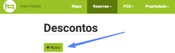 Para criar uma tabela de descontos pré-definidos, acesse o menu Reservas > Tabelas Cadastrais > Descontos e clique no botão + Novo.