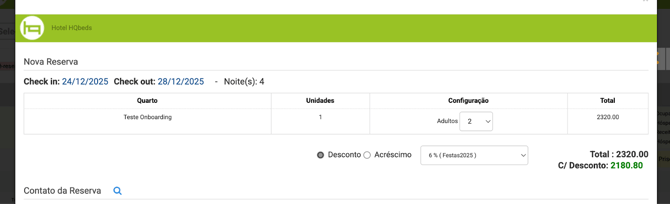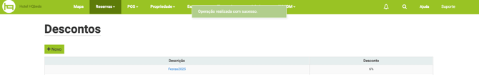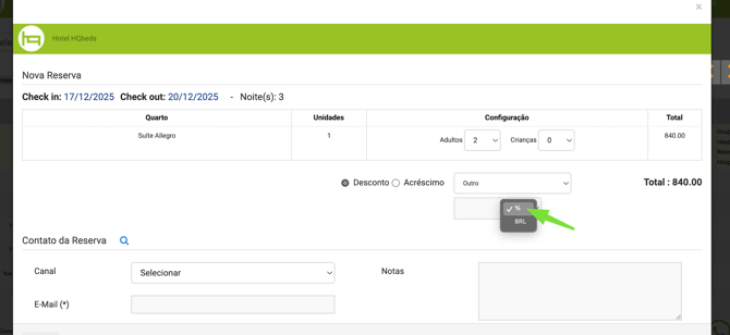 Ao lançar uma reserva pelo Mapa ou pela ferramenta Reserva por Período, você poderá aplicar o desconto previamente cadastrado.