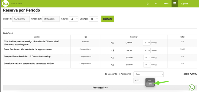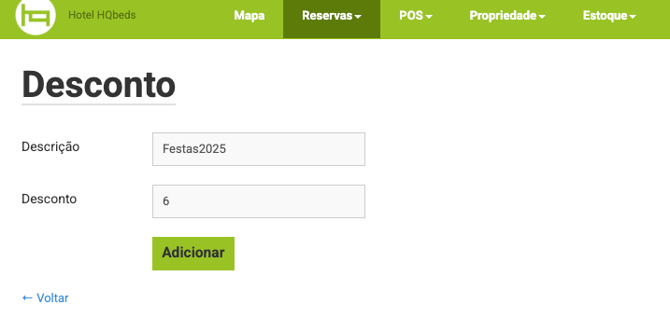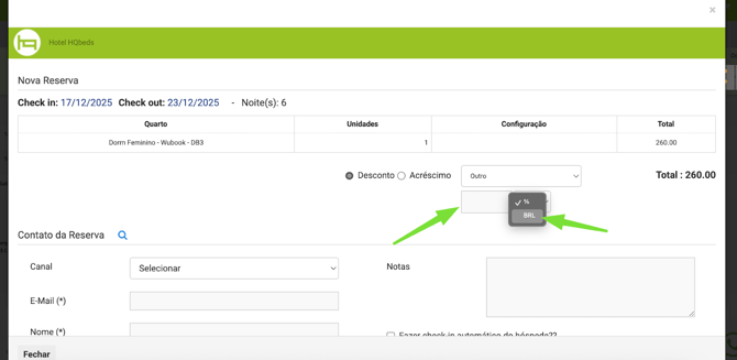 Selecione a opção de desconto em valor, conforme a moeda definida na sua plataforma hqbeds.