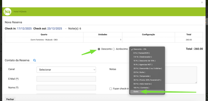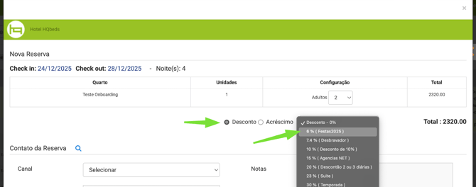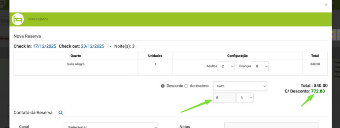 Informe o percentual desejado e visualize o total da reserva com o desconto aplicado.