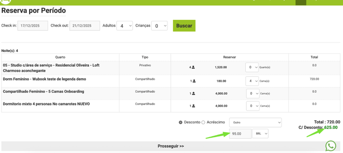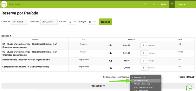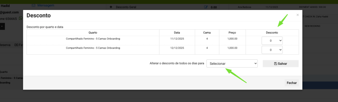 É possível aplicar o desconto individualmente em cada diária ou em todas as diárias da reserva.