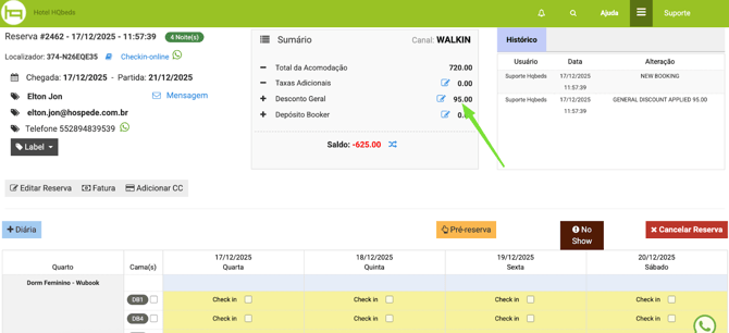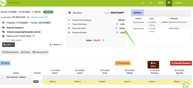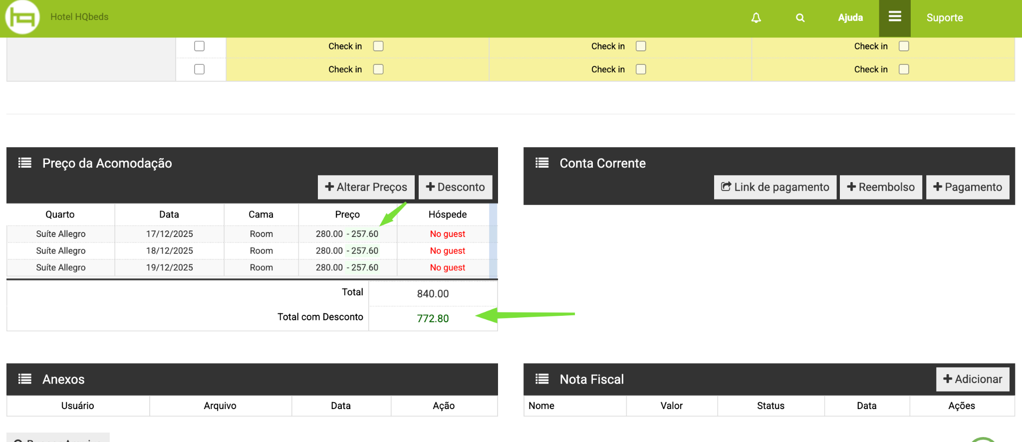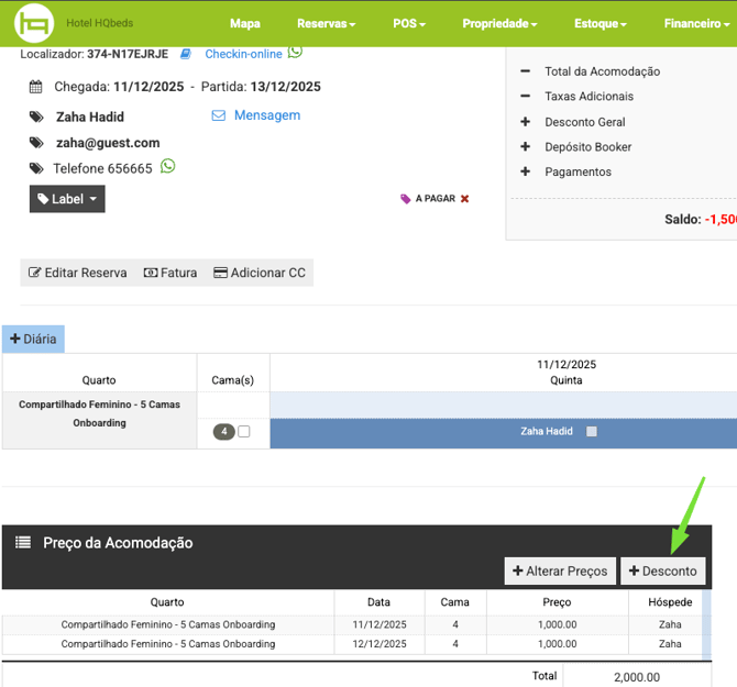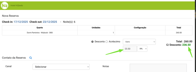 Após o lançamento da reserva, também é possível aplicar o desconto acessando a seção Preço da Acomodação e clicando no botão + Desconto.