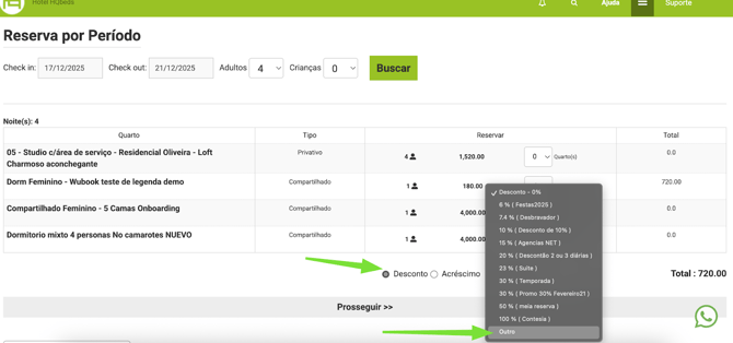 Após selecionar as diárias na tela de Reserva por Período, escolha a acomodação desejada e, em seguida, selecione o campo Desconto e a opção Outros.