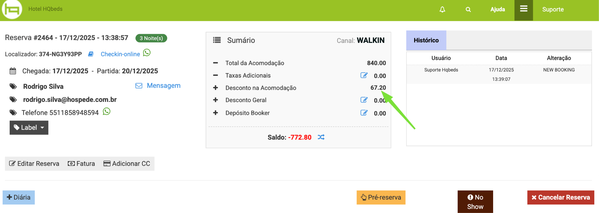 Após o lançamento da reserva, o desconto aparecerá em Desconto Geral, no Sumário da Reserva.