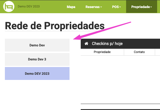 E é através do Dashboard que você vai alternar o acesso entre as redes da propriedade, clicando em cima do nome da propriedade desejada para acessar. E para fácil identificação de qual rede está logado ela ficará em destaque na lista