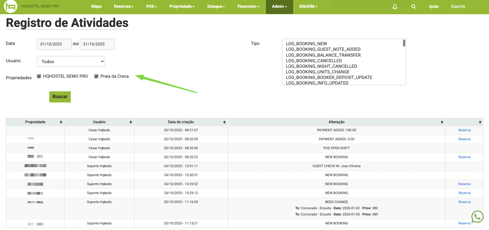 Em Propriedade > Relatórios > Registro de Atividades, para propriedades que fazem parte de uma rede, é possível monitorar o registro de atividades dos usuários em todas as propriedades vinculadas, utilizando o filtro Propriedades.
