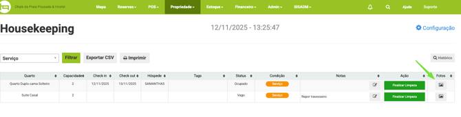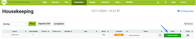 Ao iniciar a limpeza o botão mudará para a cor verde com o status de Finalizar Limpeza e a condição da acomodação mudará para Serviço, sua equipe deverá aplicar Finalizar limpeza ao concluir.