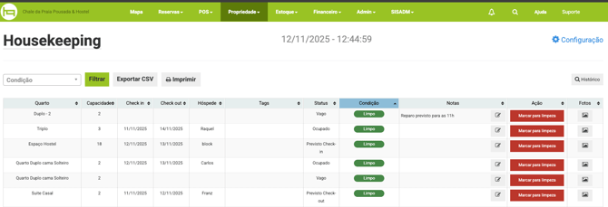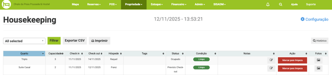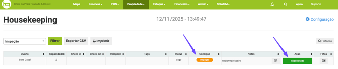 A ferramenta housekeeping conta também com a condição de limpeza inspecionada para garantir que as acomodações estejam limpas e organizadas para o recebimento de novos hóspedes.