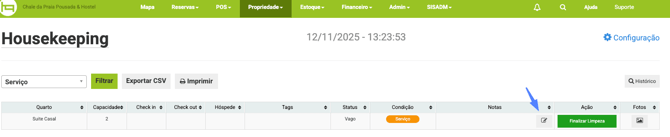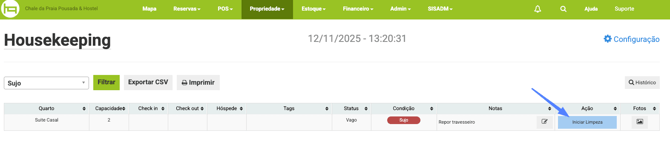 Inicie a limpeza das acomodações clicando no botão azul Iniciar Limpeza que aparece na coluna Ação