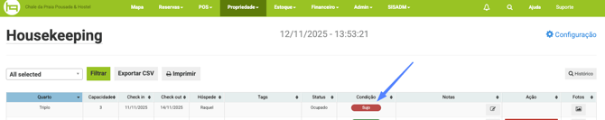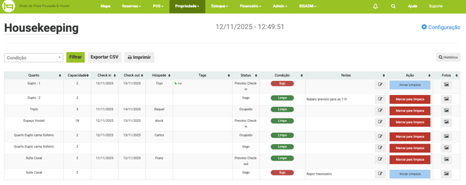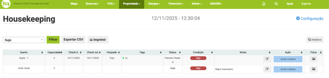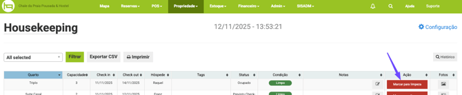 Para utilizar essa função, acesse a ferramenta Housekeeping e identifique a acomodação que necessita de limpeza e na coluna Ação clique no botão vermelho Marcar para limpeza, assim a condição da acomodação mudará para Sujo para a equipe realizar a limpeza.