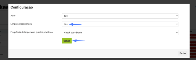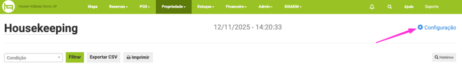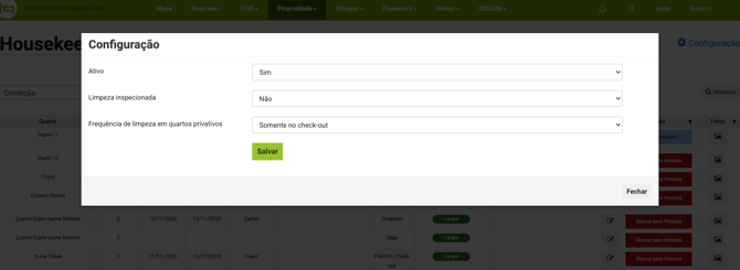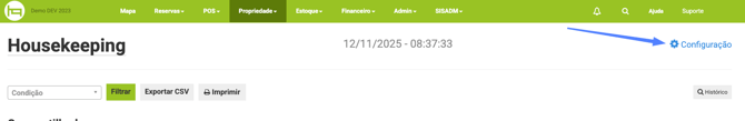 Clique no canto superior direito da tela em Configuração nessa parte é possível automatizar a frequência de limpeza para as acomodações, as frequências de limpeza disponíveis são: