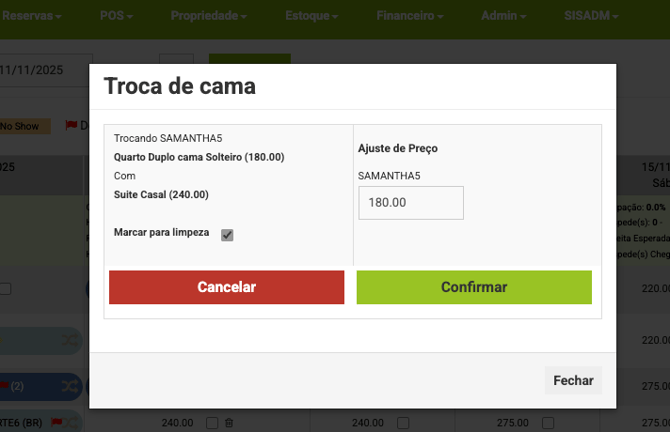 Ao realizar a troca de acomodação, quando a reserva de origem já tem check-in, vai assumir que a acomodação vai precisar de limpeza. Na tela de poup up de troca de acomodações no Mapa ou na tela de troca de acomodações dentro da reserva, como padrão a pergunta "Marcado para limpeza" já ficará selecionada ( que significa fazer a limpeza).