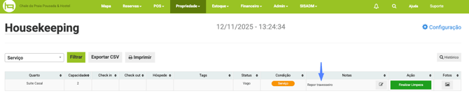 Durante a limpeza é possível incluir observações no campo Notas como detalhes da troca da roupa de cama, limpeza de suítes entre outras informações.