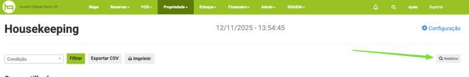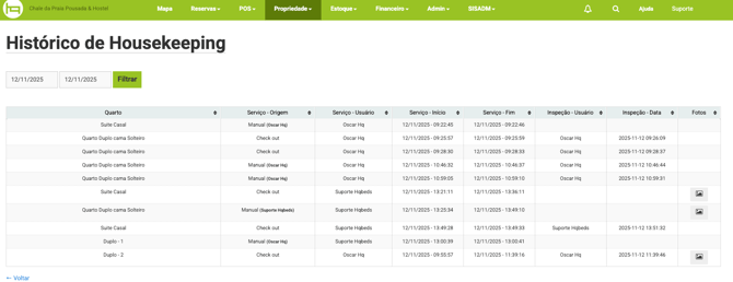 Em Histórico de Housekeeping defina o período que deseja consultar no campo Data, no resultado da consulta é possível verificar o nome da acomodação, serviço - origem, usuário que realizou o serviço, ínicio e fim do serviço e inspeção e as fotos que foram tiradas durante a limpeza