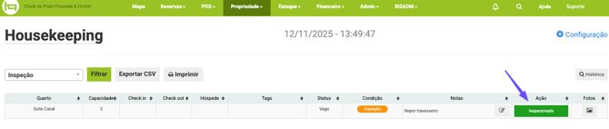 Ao concluir a inspeção clique em Inspecionado e a condição da acomodação mudará para Limpo