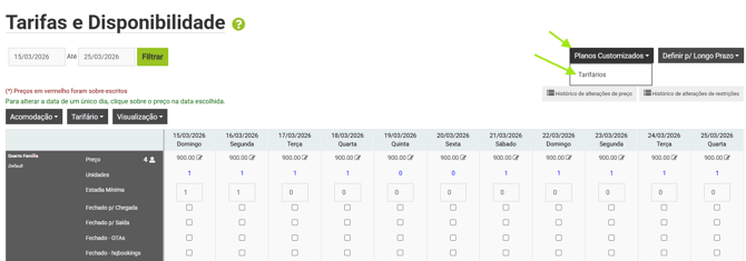 Para escolher diversos planos tarifários basta selecionar quais planos deseja na coluna tarifário. É possível selecionar apenas alguns quartos ou todos os quartos do plano e aplicar diferentes regras para quartos diferentes no mesmo plano.