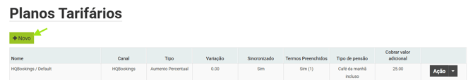 Para configurar os tarifários customizados, vá em Propriedade > Tarifas e Disponibilidade, clique no menu Planos Customizados e em seguida Tarifários e clique em +Novo para criar um novo tarifário.