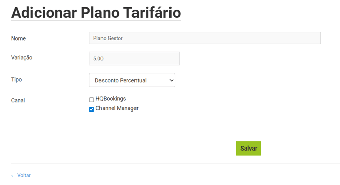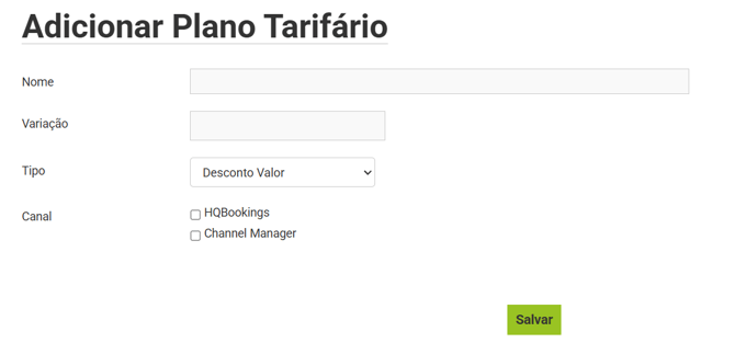 Nesta opção vamos preencher o nome do plano, a variação de valor, se é aumento/acréscimo em valor ou percentual e qual canal deseja aplicar, se hqbookings ou channel manager.